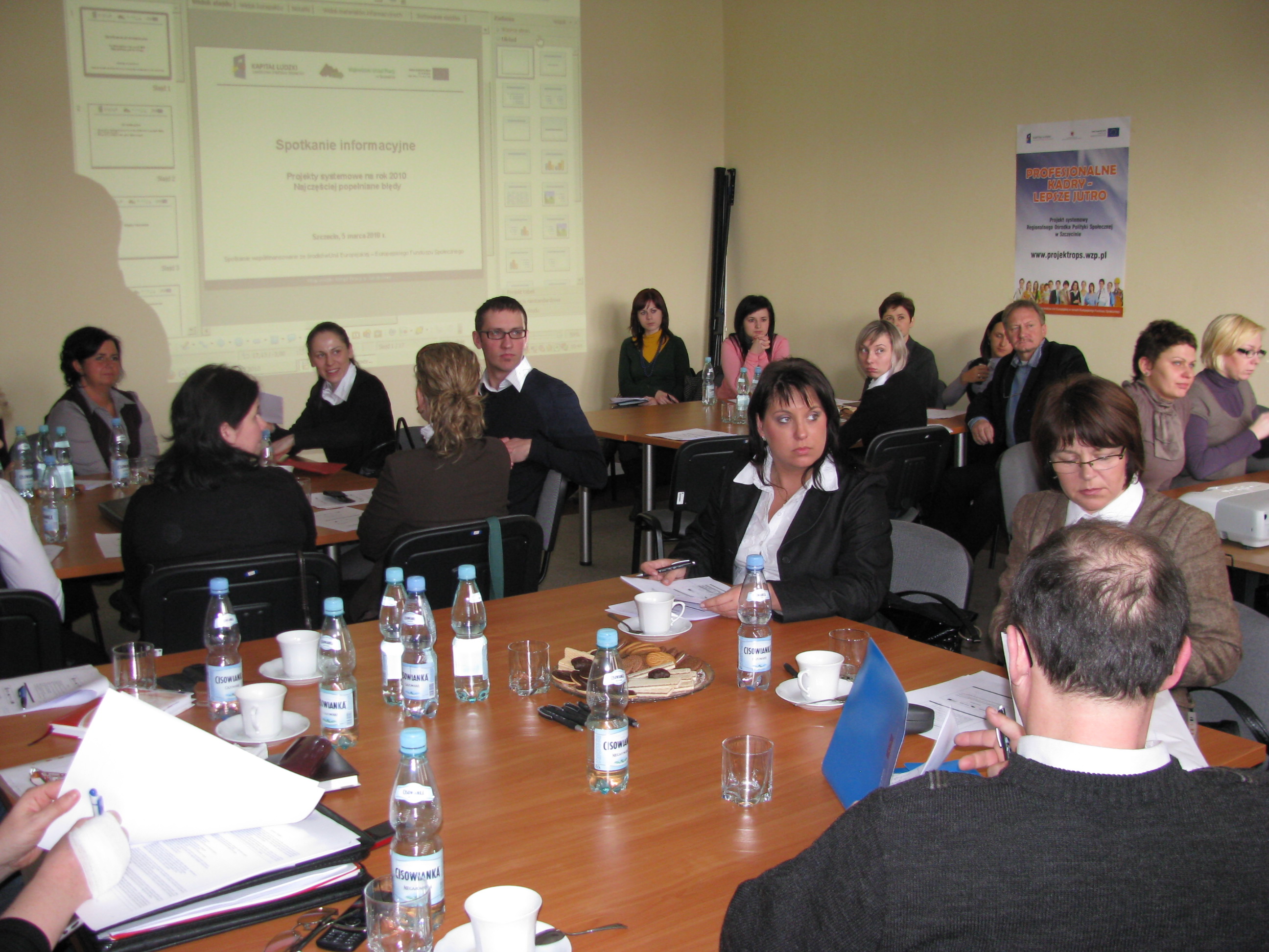 Celem spotkania było omówienie błędów popełnianych we wnioskach o dofinansowanie projektu oraz zasad przekazywania dofinansowania w roku 2010. W spotkaniu uczestniczyło 34 przedstawicieli jednostek pomocy społecznej szczebla gminnego i powiatowego z województwa zachodniopomorskiego realizujących projekty systemowe w ramach priorytetu VII PO KL. Spotkanie prowadzili pracownicy Wojewódzkiego Urzędu Pracy w Szczecinie pod kierunkiem Pani Ewy Puszkiewicz ”“ Naczelnik Wydziału Projektów Integracji Społecznej.